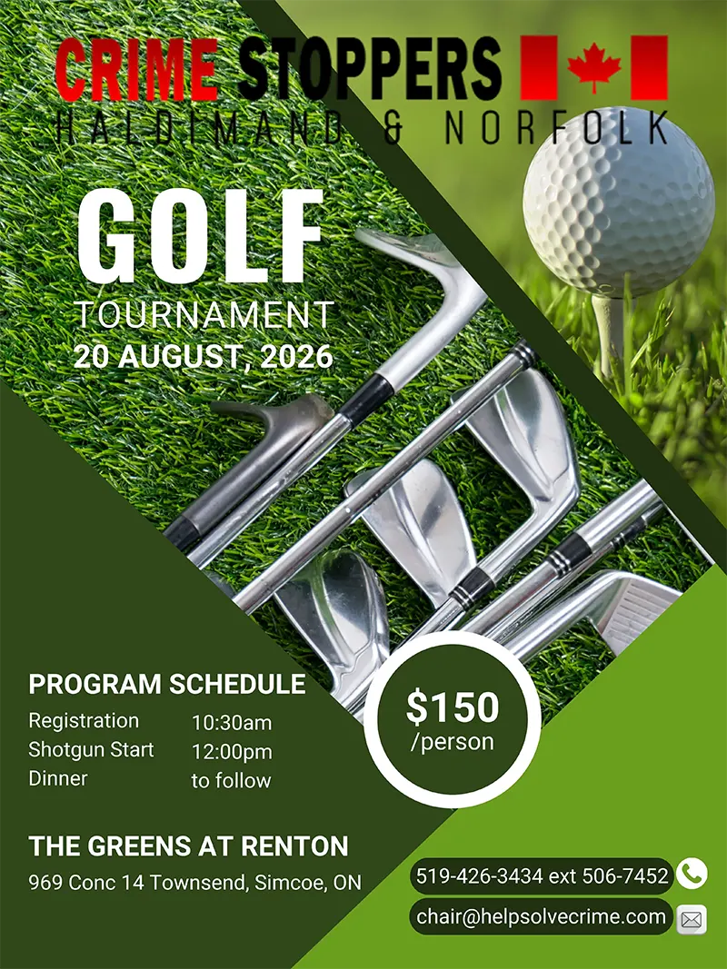 Crime Stoppers of Haldimand & Norfolk’s 34th Annual Golf Tournament is Thursday, the 20th of August, 2026 at The Greens At Renton