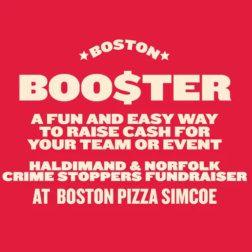 Help support Haldimand & Norfolk Crime Stoppers by purchasing tickets to “Dine for a Cause” taking place January 20th, 2026 for $20 each, held at Boston Pizza, Simcoe.
