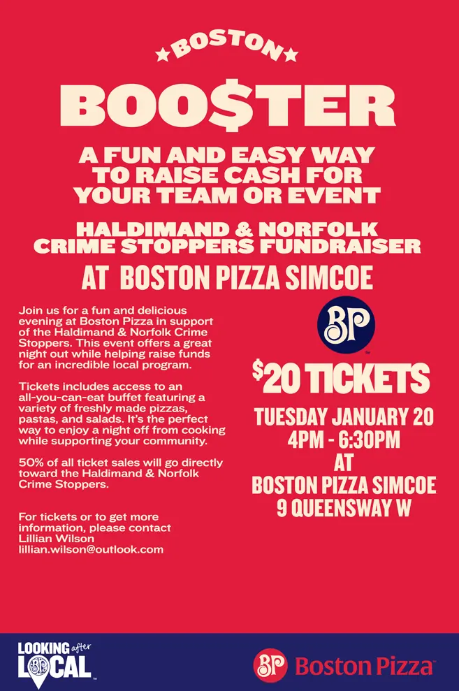 Come out for dinner at Boston Pizza in Simcoe and support Crime Stoppers of Haldimand & Norfolk. Email for tickets.